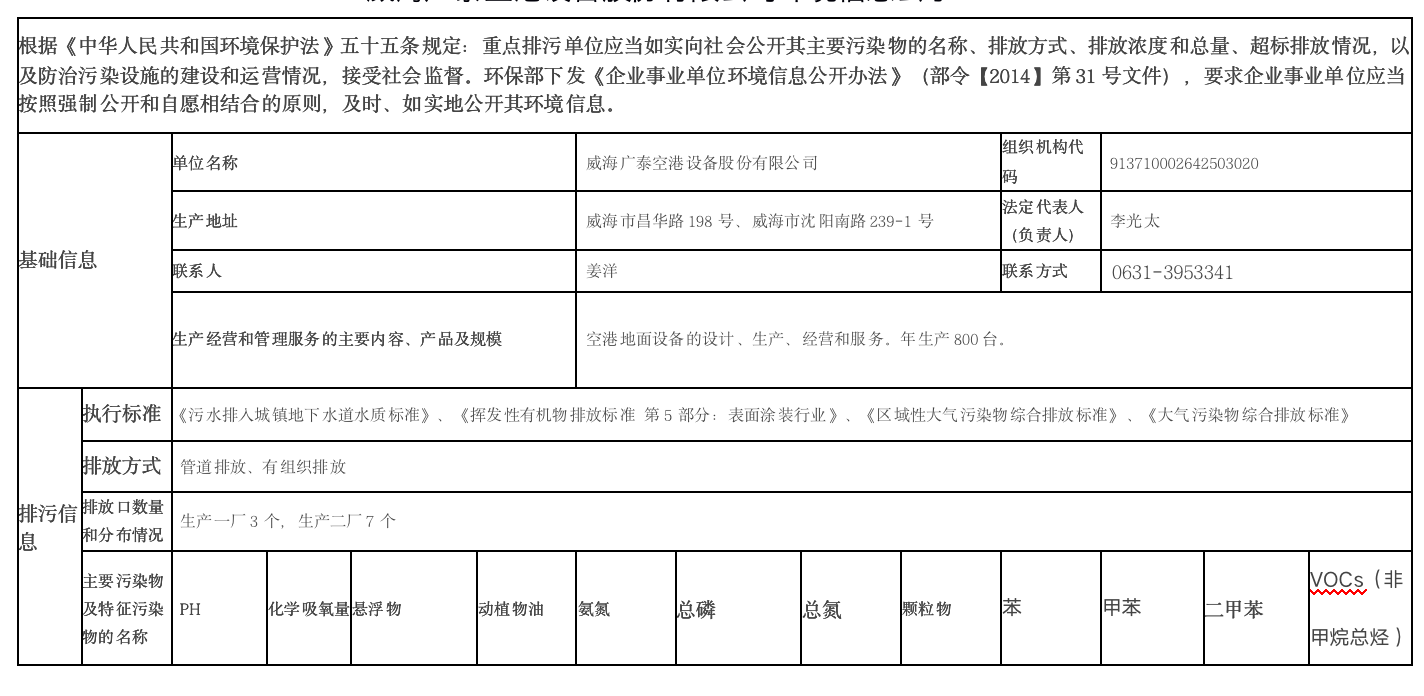 威海廣泰空港設備股份有限公司環境信息公示
